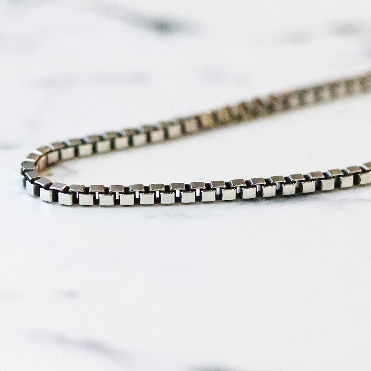 ■ BOXチェーンは別名ベネチアンチェーンと呼ばれBOX型の金具が連なり直線的なシルエットが特徴のスタイリッシュなデザインです。